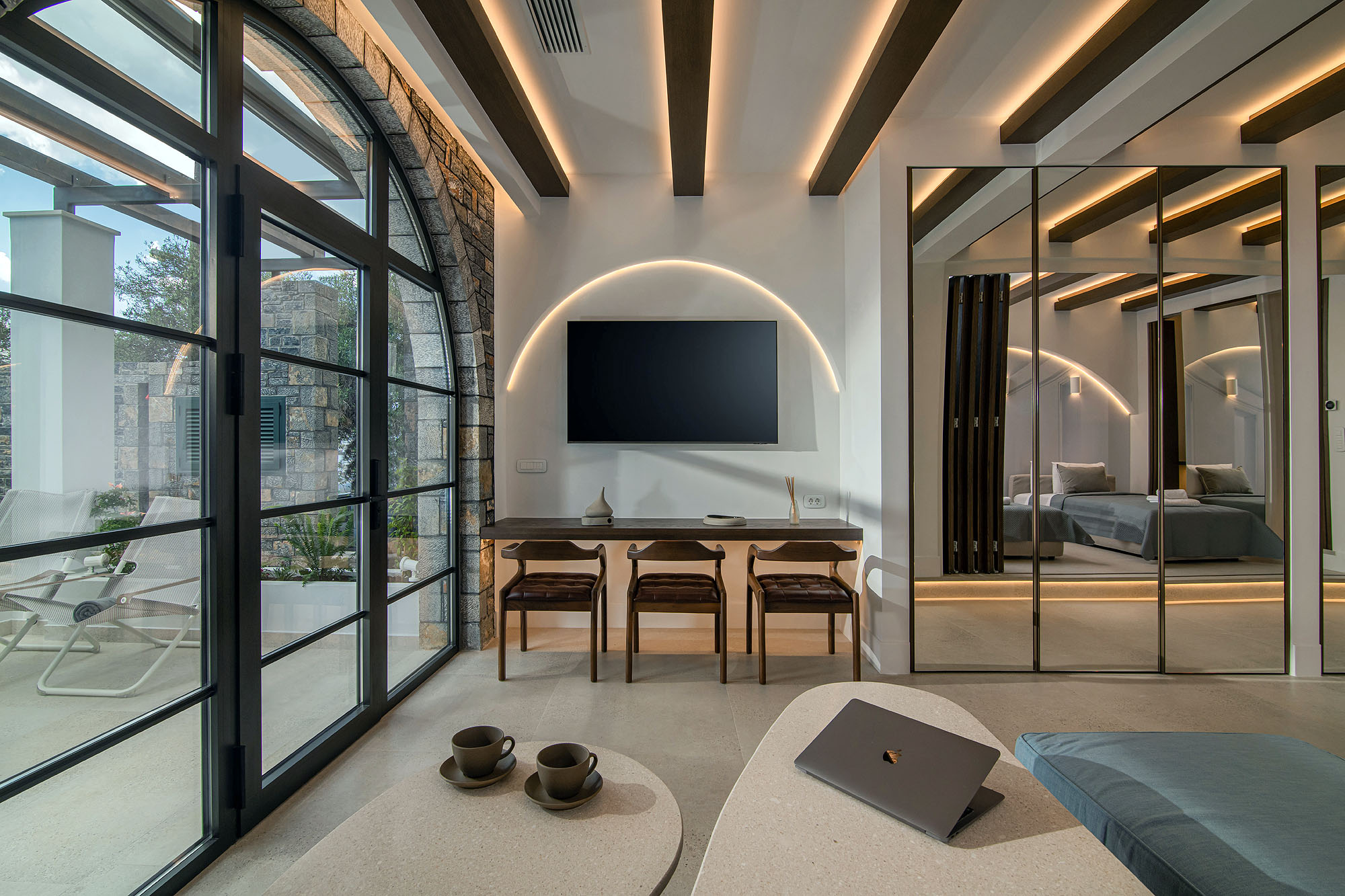 Inside, the villa features two beautifully bedrooms, each with an ensuite bathroom equipped with hammam facilities. The double bedroom exudes elegance with soft ambient lighting and mirrored accents, while the twin bedroom provides a cozy yet sophisticated space for relaxation. Both bedrooms can be closed from the other rooms. Thoughtful design elements, such as natural stone arches, sleek black-framed windows, and warm wooden beams, complement the artistic decor and create an inviting atmosphere.