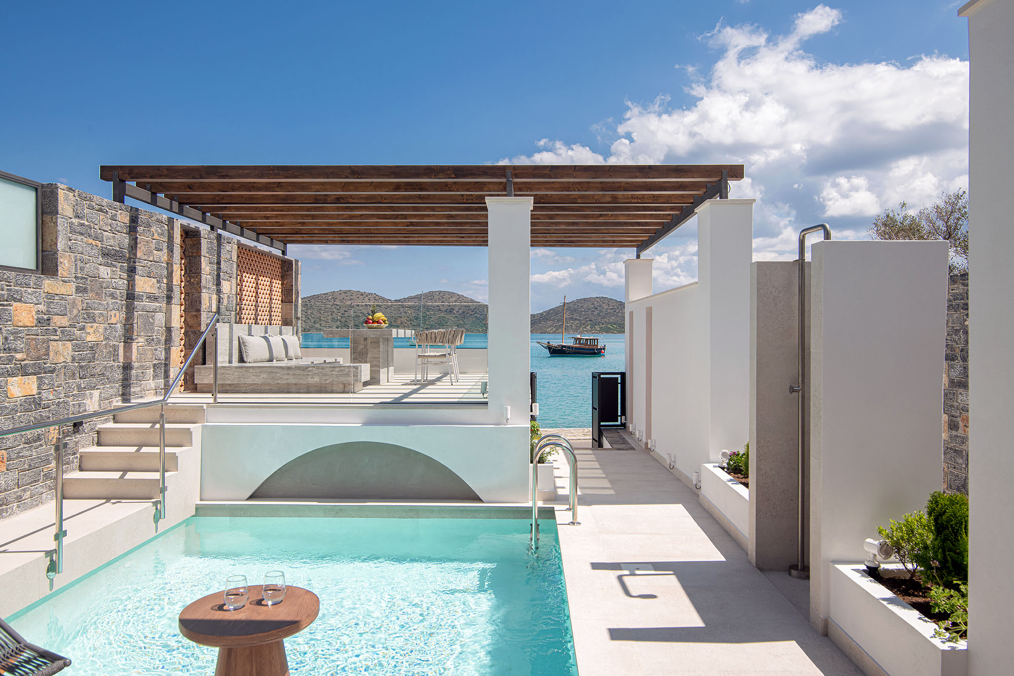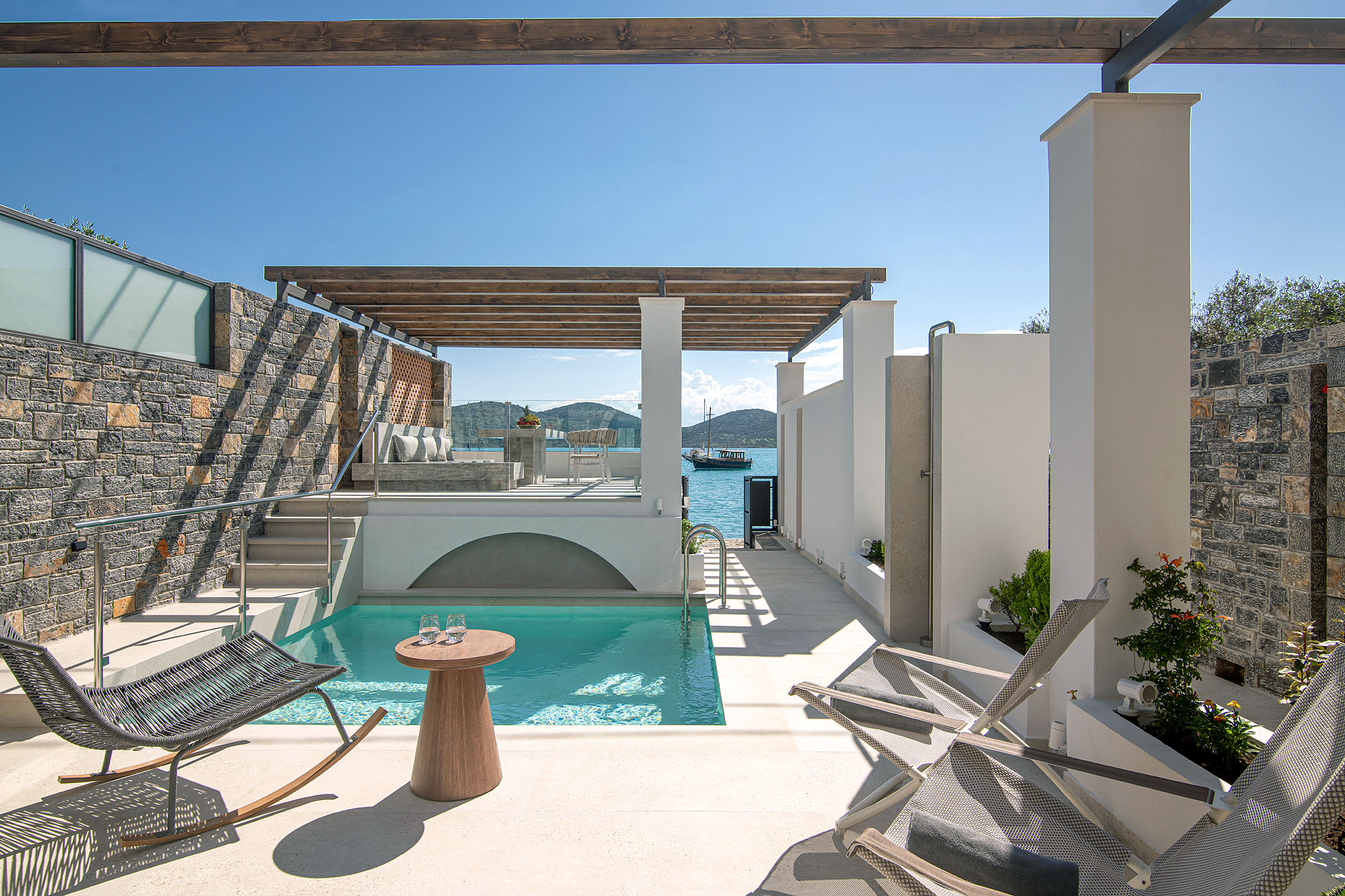 The outdoor space of the villa is equally captivating, offering picturesque views of the sea and hills. A small, pristine pool takes center stage, flanked by minimalist white walls and rustic stone detailing. Guests can enjoy the inviting seating area under a wooden pergola, which features a beautiful stone table, surrounded by cushioned benches and woven chairs. This tranquil setting is perfect for al fresco dining or unwinding as the sun sets over the horizon. The calm waters and anchored boats complete the scene, making the villa a delightful escape into the beauty of Elounda.
